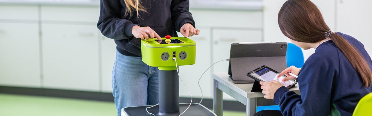 Mobile unit for supplying media such as electricity and WLAN – “Science to go!” Supports self-directed learning and modern didactic concepts. Flexible use anywhere in a room or even outside traditional classrooms. The use of the Strom-Buddy is not restricted by RiSU or other safety regulations, so operation is possible even outside conventional specialized classrooms.